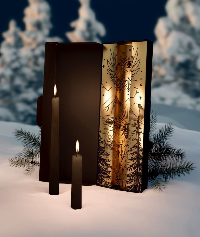 Kynttilät ja pakkaus valmistettu Suomessa.