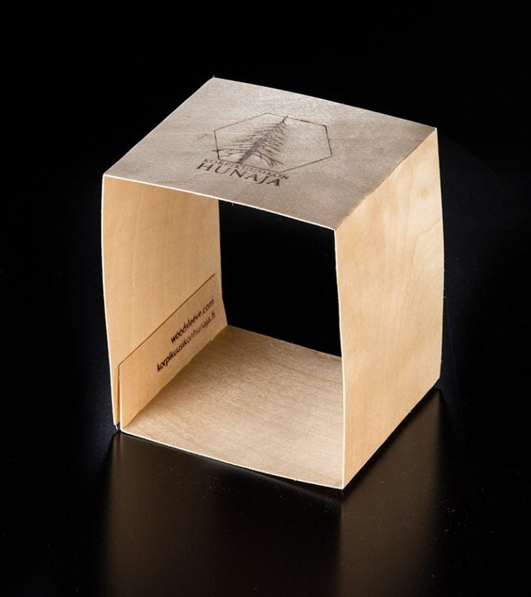 Personoidussa tuotteessa kartonkisen lahjapakkauksen päällä on erillinen vanerivyöte joka polttomerkataan yrityksen logolla tai vapaavalintaisella tekstillä.